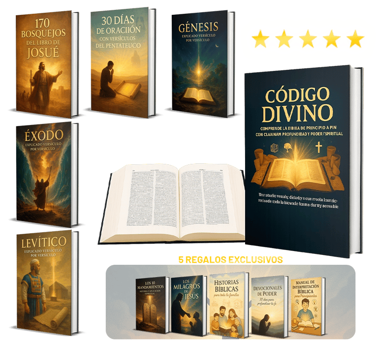 Al adquirir El Código Divino, obtendrás el material principal completo para tu crecimiento espiritual. Además, recibirás de regalo la exclusividad destos 5 libros especiales, cuidadosamente seleccionados para profundizar tus estudios bíblicos, ampliar tu comprensión espiritual y revelar verdades más profundas de la Palabra de Dios que muchos nunca llegan a descubrir.